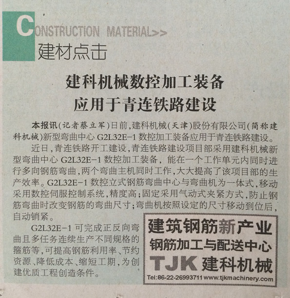 本报讯(记者蔡立军)日前,建科机械(天津)股份有限公司(简称建科机械)新型弯曲中心G2L32E_1数控加工装备应用于青连铁路建设。